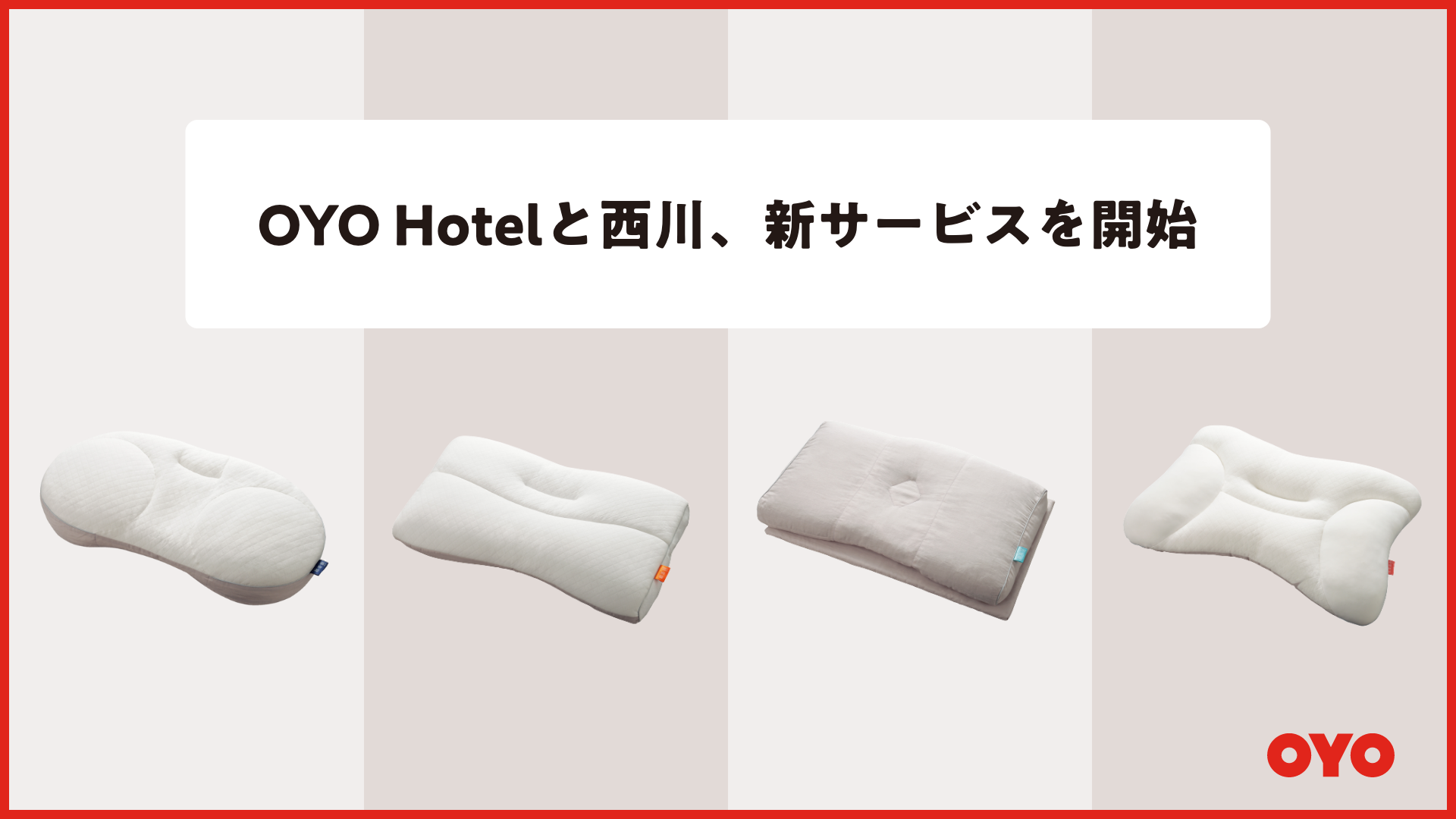 本連携の第一弾として、全国にあるOYO Hotelが運営する北海道や福岡の8施設に対し、睡眠の質向上につながる西川の『医師がすすめる健康枕シリーズ』を無料で貸し出すサービスを提供します。今後もOYO Japanは「好きなときに、好きな場所へ」のコンセプトのもと、ご利用いただくゲストの方に有益かつ高品質な滞在の実現に向け、サービスの提供先を拡大させる方針です。