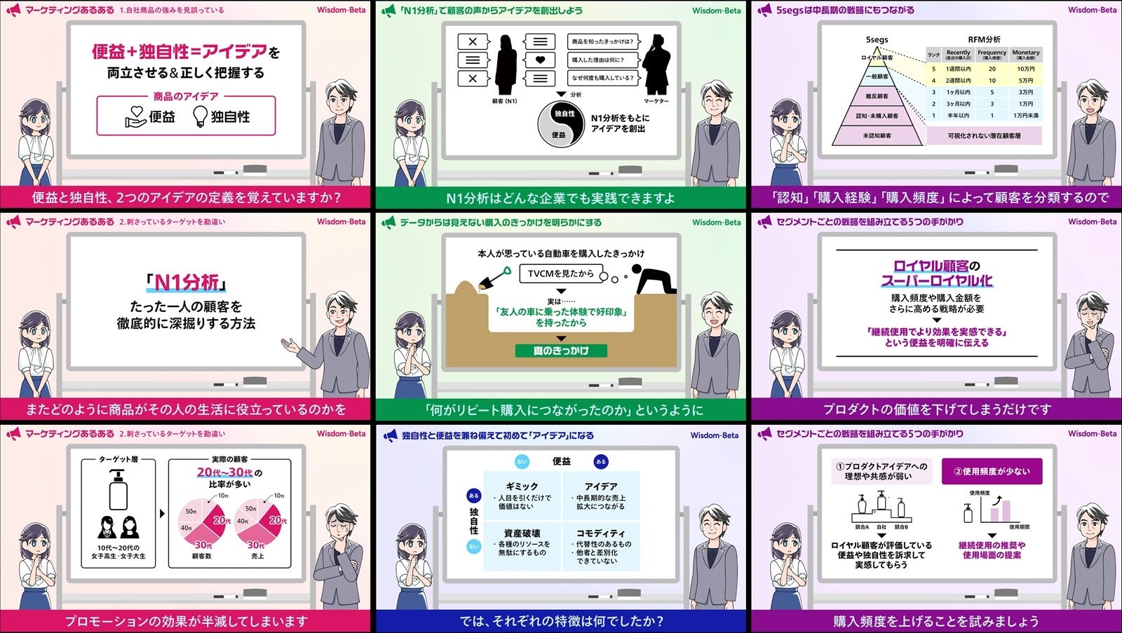 アニメで学ぶ、実践思考: ある売上低迷に悩むブランドの再生ストーリーを通じて、主人公の奮闘を追体験。マーケティングの専門知識がない人でも、課題発見からアイデア創出、戦略実行に至るプロセスを自然に身につけられます。