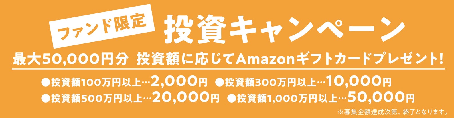 本ファンド投資額に応じて、最大50,000円分のAmazonギフト券をプレゼントいたします。詳しくは公式サイトをご覧ください。