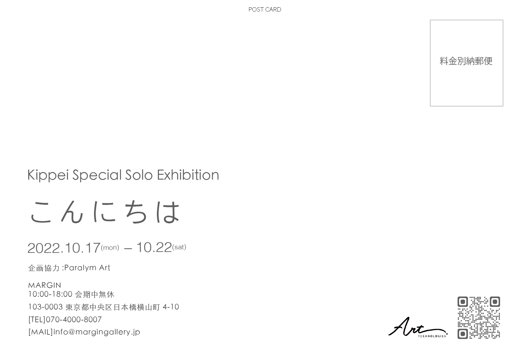 (一社)障がい者自立推進機構(本社 : 東京都港区)はArt Technologies株式会社(本社:東京都中央区)運営のもと、ART TECHNOLOGIESギャラリーMARGIN(場所 : 中央区日本橋)にて2022年10月17日(月)〜22日(土)まで、アール・ブリュットアーティストkippei特別展「こんにちは」を開催いたします。