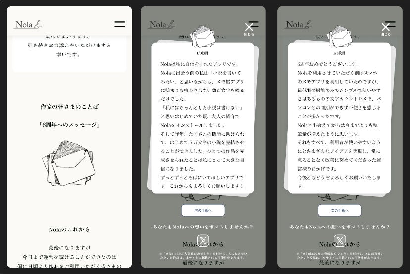 このたび公開した「50万会員突破記念サイト」では、上記の取り組みを含めた6年間の軌跡と背景にある想いを綴った「Nolaの生い立ち」や、これまで関わってくださった皆さまへ感謝を込めた運営メッセージに加え、「Nola」利用者の皆さまからお寄せいただいた500件を超えるお祝いメッセージも掲載しております。