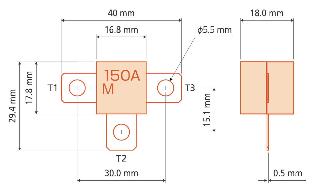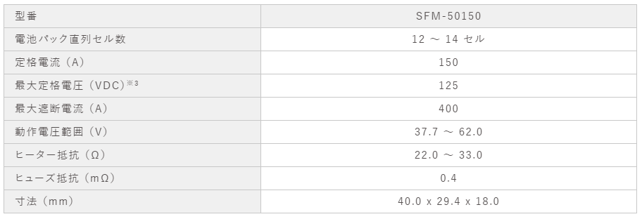 従来品よりもヒューズエレメントに厚みを持たせてヒューズ抵抗を下げることで、当社ラインアップ史上最大となる定格電流150Aを実現。大電流を必要とする電動バイクや、蓄電池などのエネルギー貯蔵システムに最適。