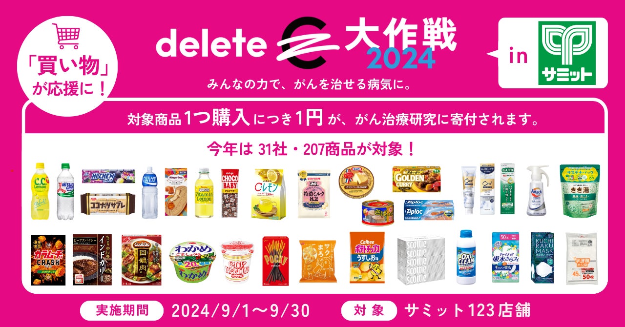 認定NPO法人deleteC(デリート・シー/代表理事:小国士朗)は、ふだんの暮らしの中で、がん治療研究を応援するカジュアルソーシャルアクション※の一つとして、関東エリアを中心にスーパーマーケットを展開するサミット株式会社(代表取締役:服部哲也)とタッグを組み、2024年9月1日(日)~9月30日(月)の期間中、買い物ががん治療研究の応援につながる「deleteC大作戦 2024 inサミット」をサミット全123店舗にて実施します。