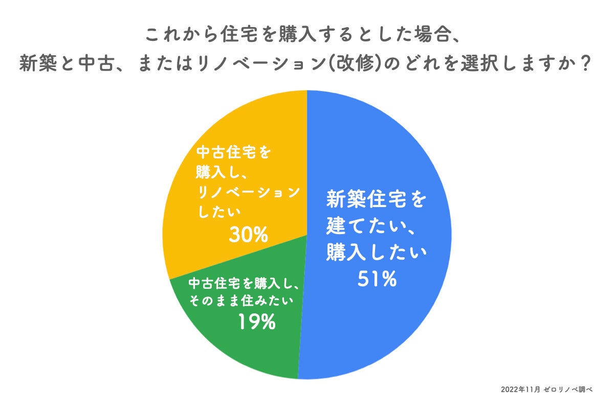 「これから住宅を購入するとした場合、新築と中古、またはリノベーションのどれを選択するか」を聞いたところ、以下の結果になりました。