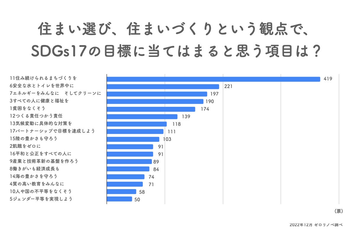 「住まい選び、住まいづくりという観点で、SDGsの目標に当てはまると思うもの」を聞いたところ、以下の結果になりました。(複数回答)