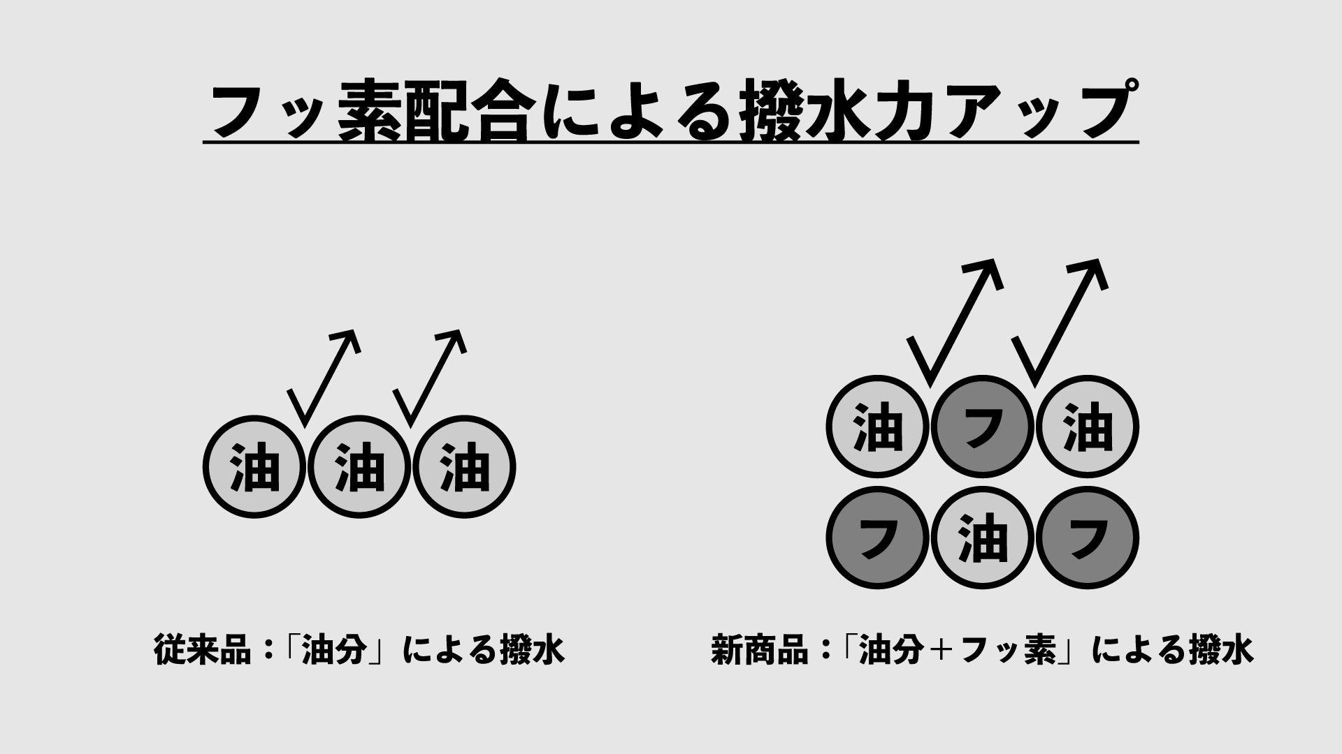 今回新発売するモデルは、新たに撥水成分である「フッ素」を配合しています。