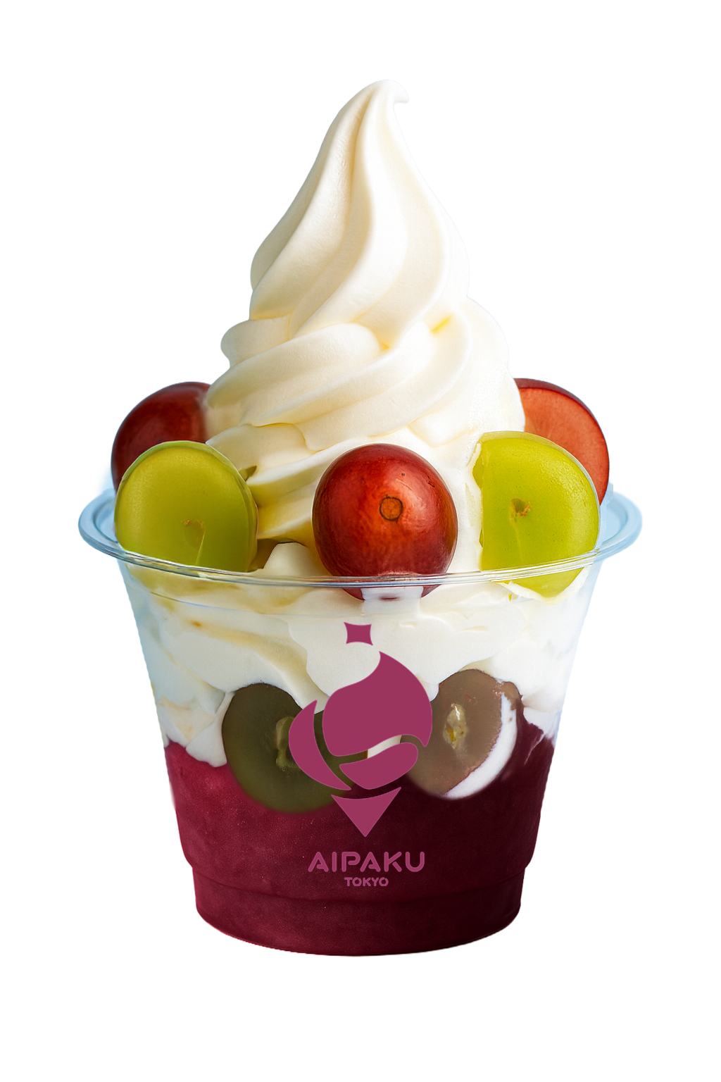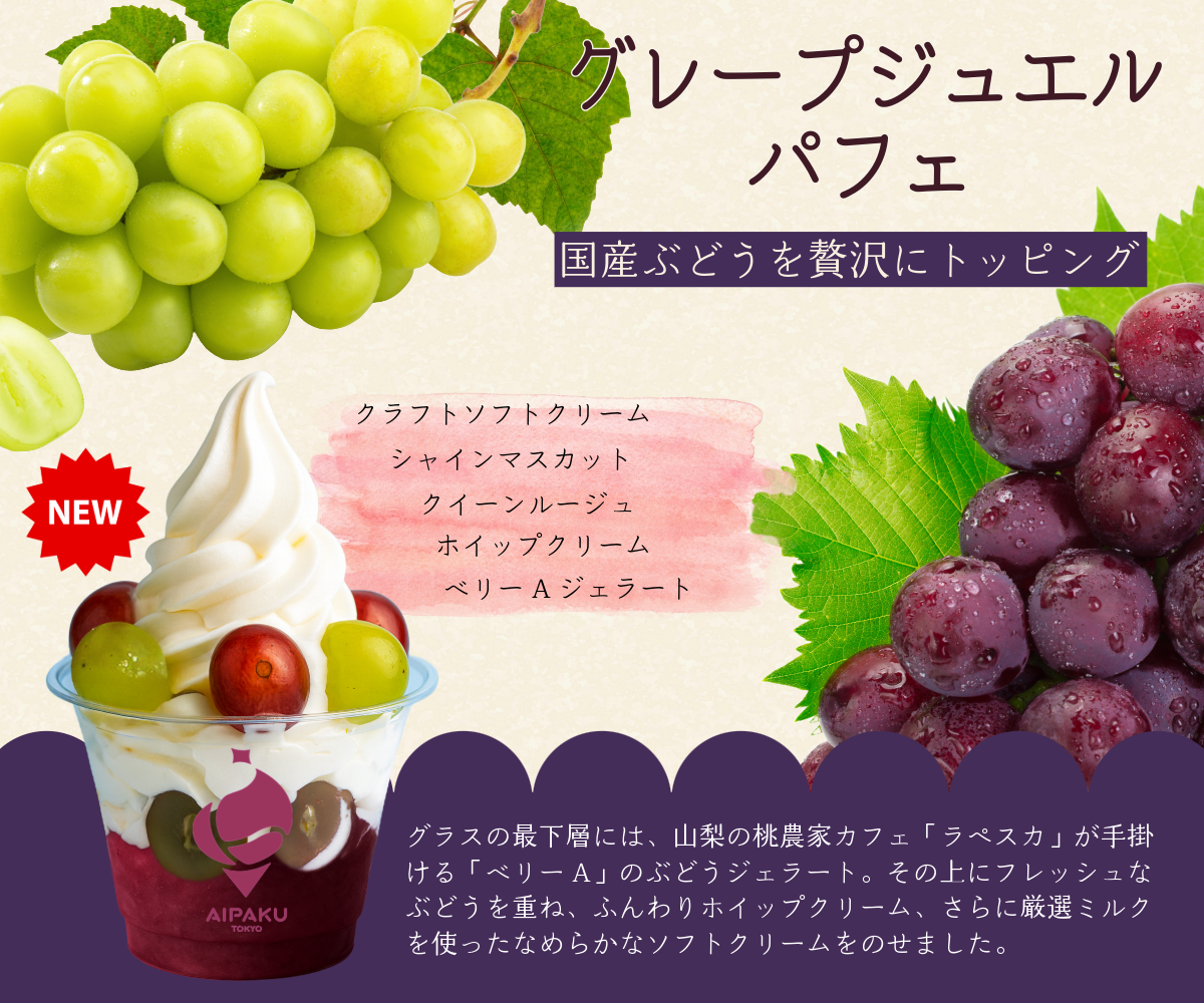カップ容器の最下層には、山梨の桃農家カフェ「ラ・ペスカ」手掛ける「ベリーA」のぶどうジェラートをたっぷりと敷き、その上にフレッシュなぶどうを重ね、ふんわりホイップクリームと北海道・道東エリアの厳選ミルクを使ったなめらかなクラフトソフトクリームをトッピング。