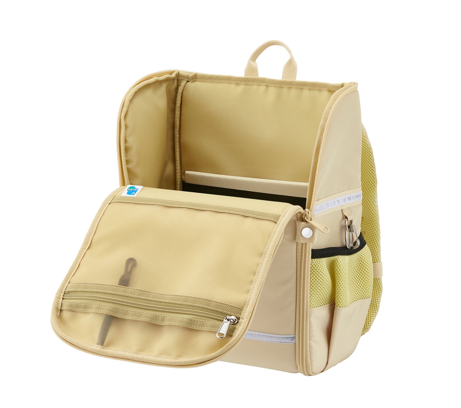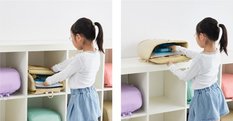 従来のランドセルにある「カブセ」を無くしたファスナー式なので、開閉位置を自由に変えることができます。これにより上からも横からもパッと荷物の出し入れが可能に。また、ファスナーを全開にすると、ガバっとフルフラットに開いて中身を確認できます。使わないときは、コンパクトに畳んで収納も可能です。