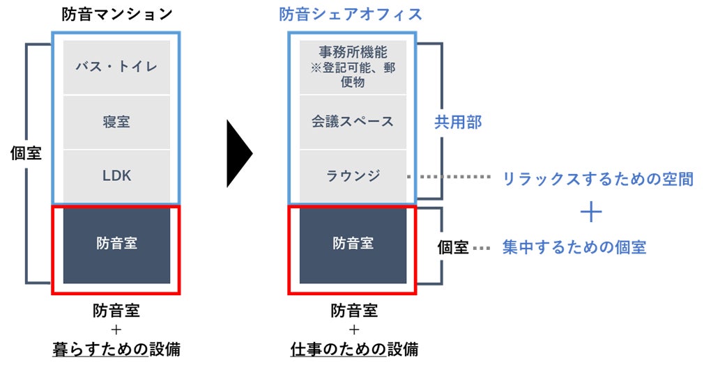 他にも法人登記にも対応しているほか、1階には受付や社名を表示するディスプレイ、郵便受けがあります。防音マンションと「BLOCKS MUTE」の主な違いは図を参照ください。防音マンションのキッチン、バスといったスベースが、「BLOCKS MUTE」は会議スペース、ラウンジなどの必要なオフィス機能になります。