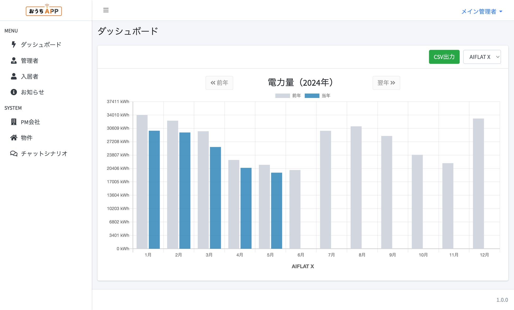 入居者は自宅の時間別/日別/月別の電力量を確認でき、物件管理者は一棟の月別の電力量を一括管理できます