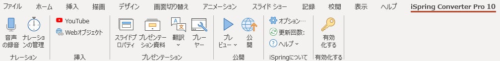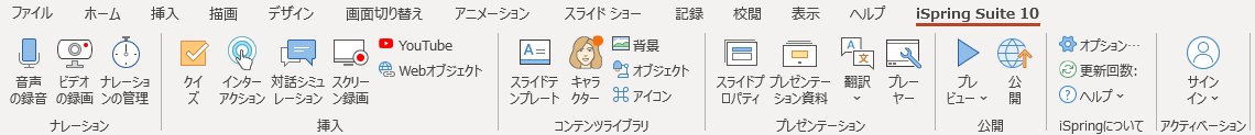 iSpring Suite Max および、iSpring Suite 10 を使用すると、Microsoft® PowerPoint で作成したプレゼンテーションから、ワンクリックで高品質な HTML5 コンテンツを生成することができます。インストールすると、Microsoft® PowerPoint のアドインとしてツールバーが追加され、Microsoft® PowerPoint から簡単に変換を実行できるようになります。