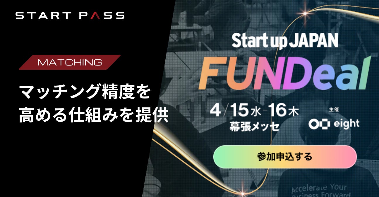 株式会社StartPass(本社:東京都新宿区/代表取締役CEO:小原聖誉)は、Sansan株式会社(本社:東京都渋谷区/代表取締役社長:寺田親弘)が提供する名刺アプリ「Eight」のスタートアップ×事業会社マッチングカンファレンス「Startup JAPAN FUNDeal 2026」(開催日:2026年4月15日〜16日、会場:幕張メッセ 国際会議場)において、スタートアップと事業会社のマッチング精度を高める仕組みを提供します。