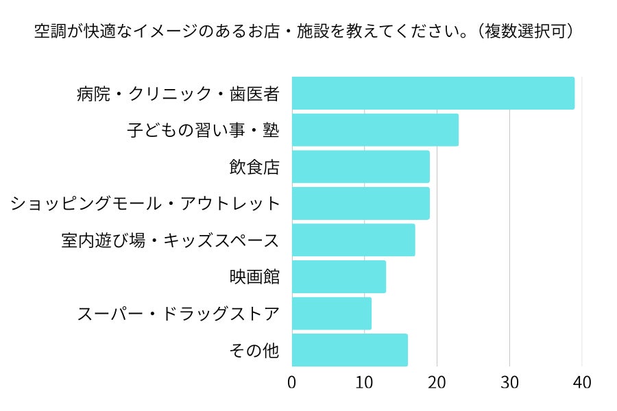 空調が快適なイメージのある施設を尋ねたところ、「病院・クリニック・歯医者」が39回答で圧倒的多数となりました。