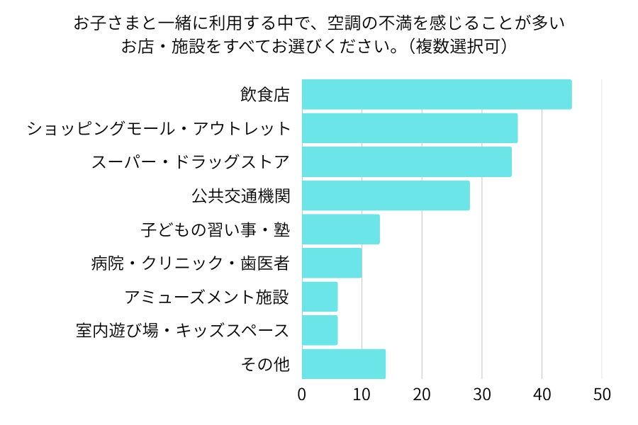 空調の不満を感じることが多い施設を複数回答で尋ねた結果、「飲食店(ファミレス・カフェ・ファストフードなど)」が45回答で最も多く、次いで「ショッピングモール・アウトレット」が36回答となりました。