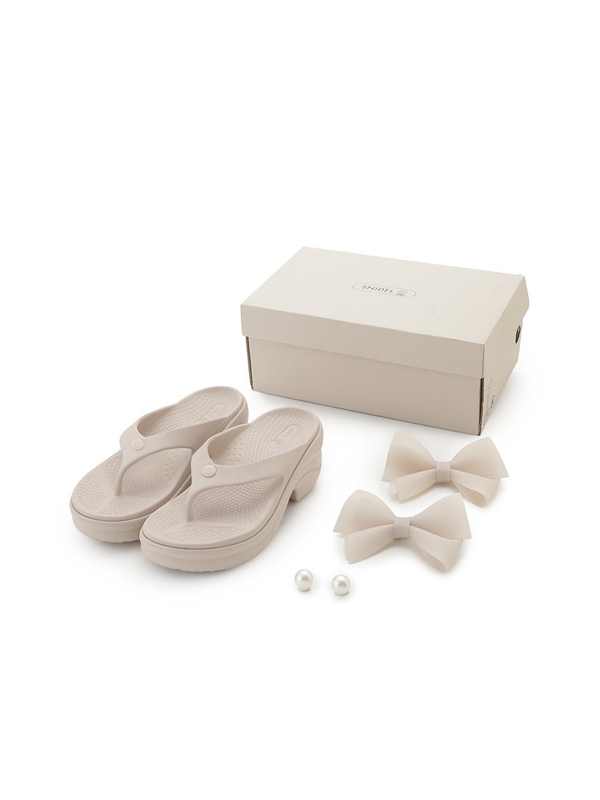 なかでも本モデルは、シダスとして初となる厚底仕様のリカバリーサンダルとして開発された点も大きな特長です。弾力のある厚底ソールが足元をほどよく支えつつ、自然なスタイルアップを演出。さらに、SNIDELらしいフェミニンなアレンジとして、取り外し可能なオリジナルリボンとパールパーツを付属し、その日のスタイリングや気分に合わせて表情を変えられる仕様に仕上げています。インソールには“SNIDEL”ロゴを施し、コラボレーションならではの特別感も高めました。
