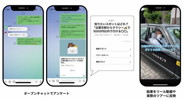 出雲の気になるスポットや知りたい観光情報について、オープンチャット内でみんなの声を募集。集まった意見や質問に対してInstagramのリール動画でアンサーを返したり、さらにはオープンチャットで集めたみんなの意見からツアーが生まれたりするかも?