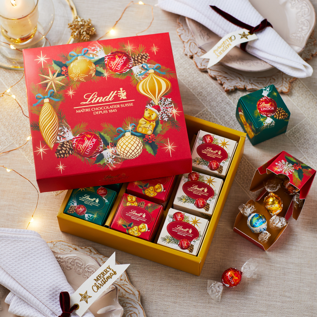 ボックスを開けると、クリスマスをイメージした賑やかで華やかなデザインの9箱のキューブが入ったシェアギフト。キューブの中には、リンドールやリンツテディが描かれた包みのチョコレートなどをアソート。お子様から大人まで大人数でシェアして楽しむことができ、ホームパーティでのテーブルを華やかに彩ります。