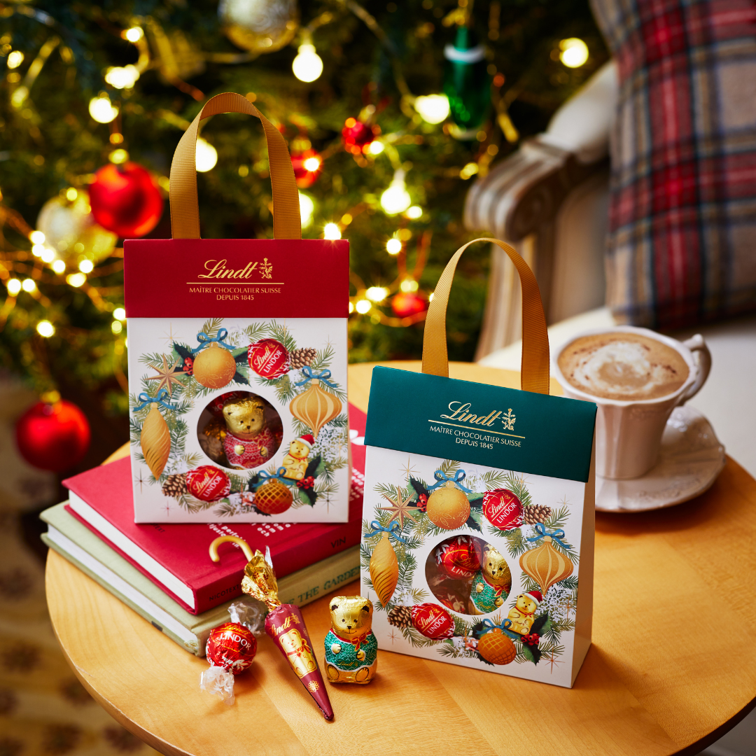 持ち手がついたバッグ形状のギフト。リンドールやリンツテディ柄チョコレート、リンツテディが描かれたアンブレラ型チョコレートが詰まっています。リースをモチーフとしたデザインに、レッドとグリーンの2色をご用意しました。ちょっとした手土産や感謝を伝えたい時などカジュアルな贈り物にぴったりです。