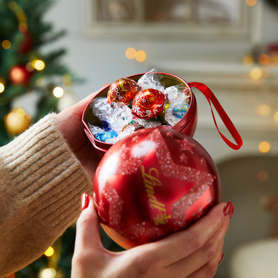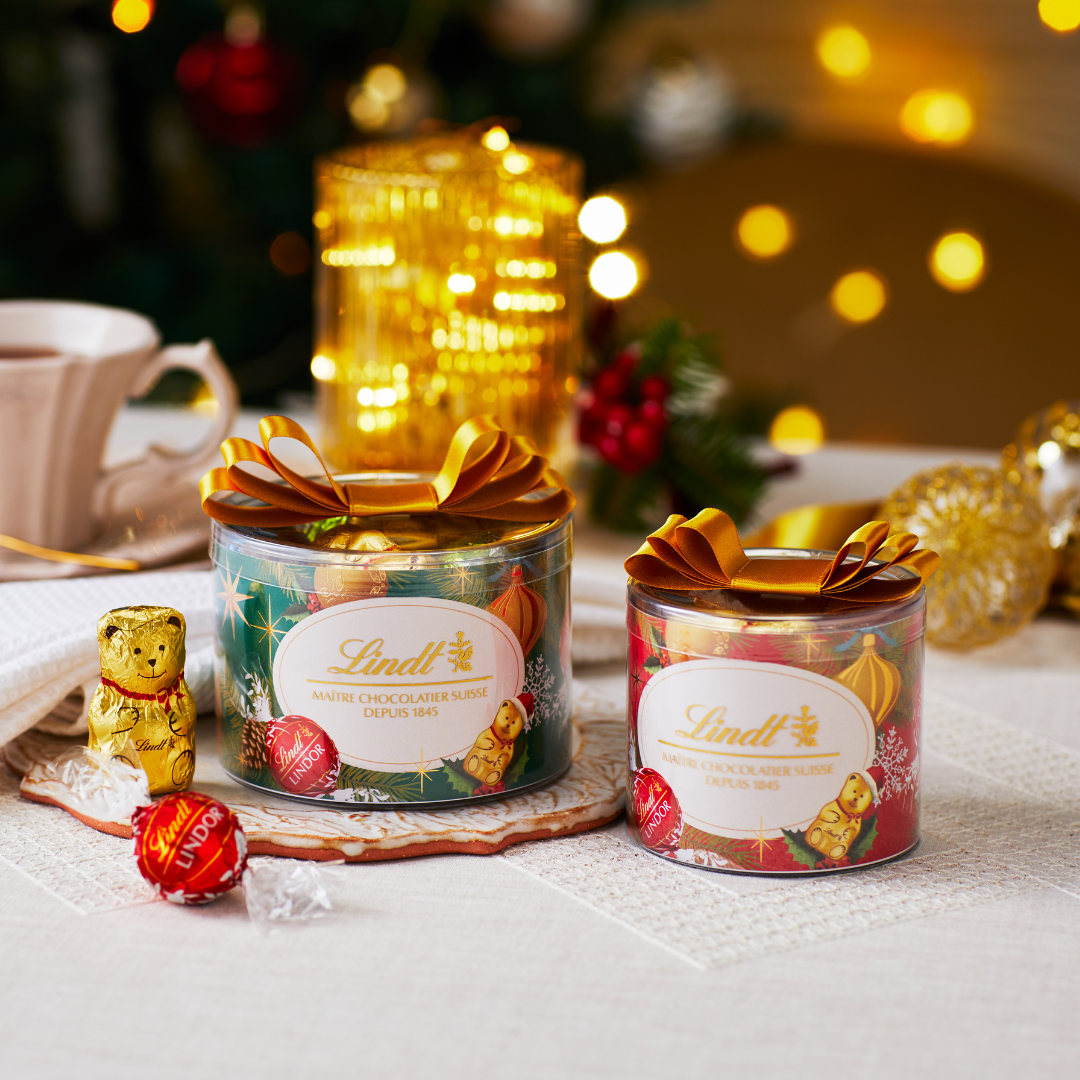 リンツテディ形状のギフト缶には最大で50個、赤いボール型のオーナメント缶は最大で15個、自分の好きなリンドールを入れることができます。テディ缶はクリスマスの思い出に小物入れとして、オーナメント缶はツリーに飾ったりと食べた後もお楽しみいただけます。