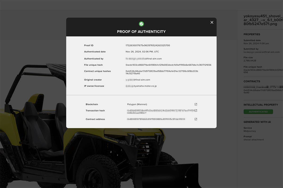24年1月には、ヤマハ発動機との共創によるマイクロEVトラクターのコンセプトデザインを発表。生成AIを活用することで従来プロセスや創造性を加速させました。弊社独自のスマートコントラクト技術によるデザイン・知財管理プラットフォームも導入することで、中間生成物や最終データの知的財産権を担保することに成功し、安心・安全な生成AIによるデザインプロセスを実現しました。