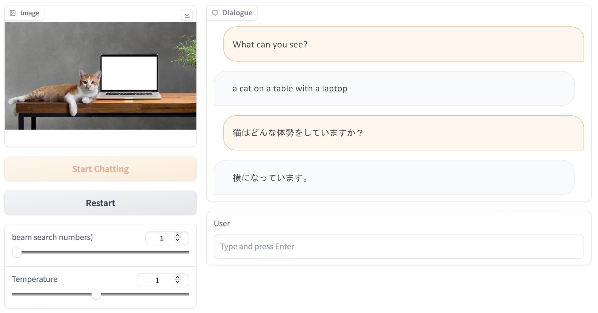 ・画像対話モデルの出力例(画像とオレンジがユーザー入力、グレーがモデル出力)