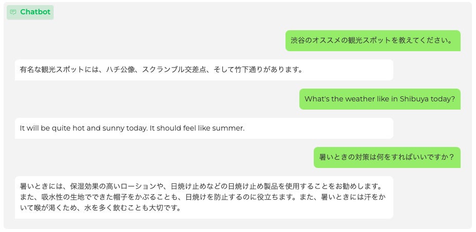 ・対話言語モデルの出力例(緑がユーザー入力、白がモデル出力)