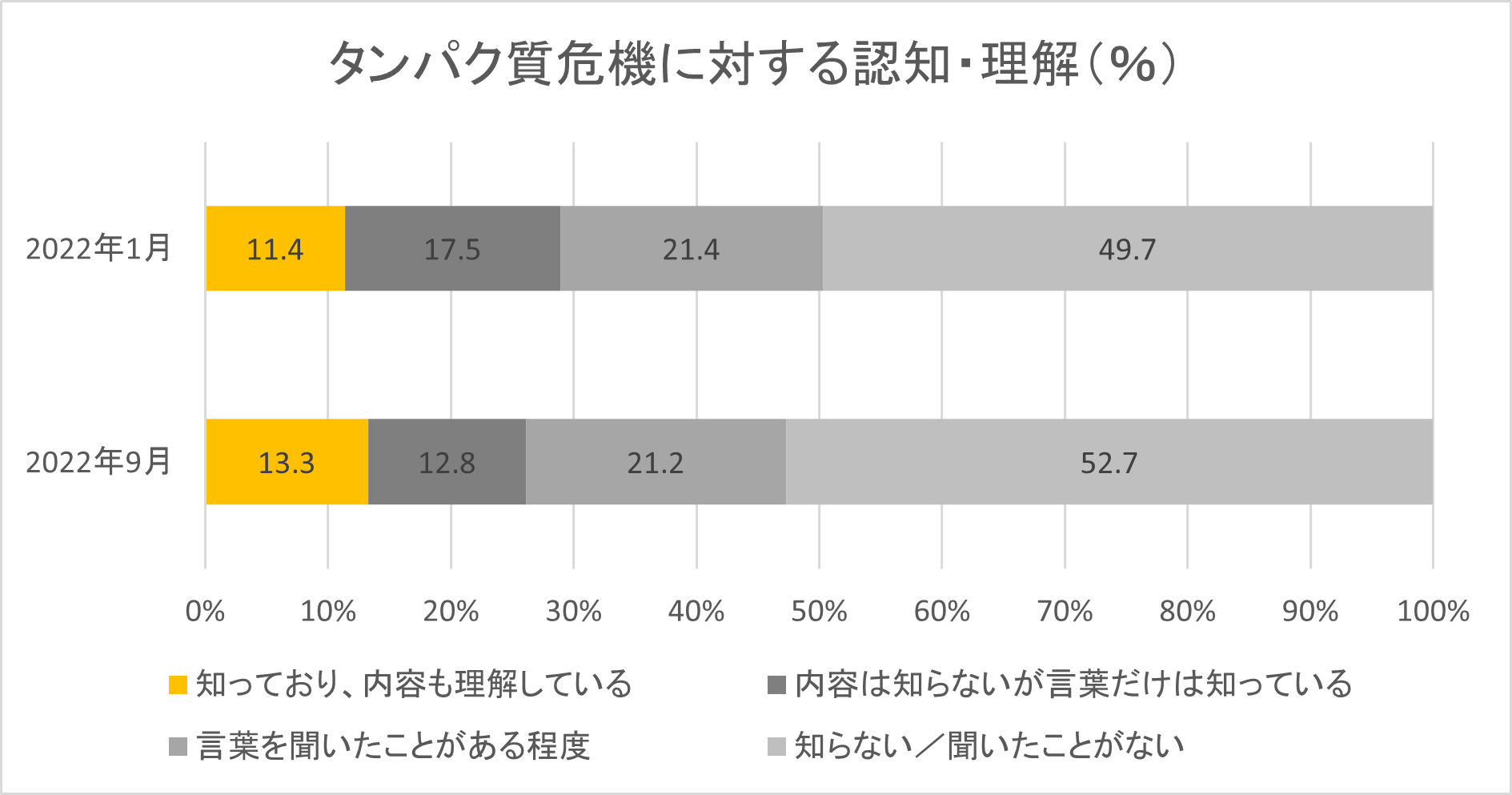 また前回実施時に課題点として提示した、急激な人口増加に伴って世界的にタンパク質が不足する「タンパク質危機」と呼ばれる食料問題の認知および理解に関する設問では、内容を理解している方の割合が13.3%に増えたものの、全体としての認知率は依然として低い結果となりました。