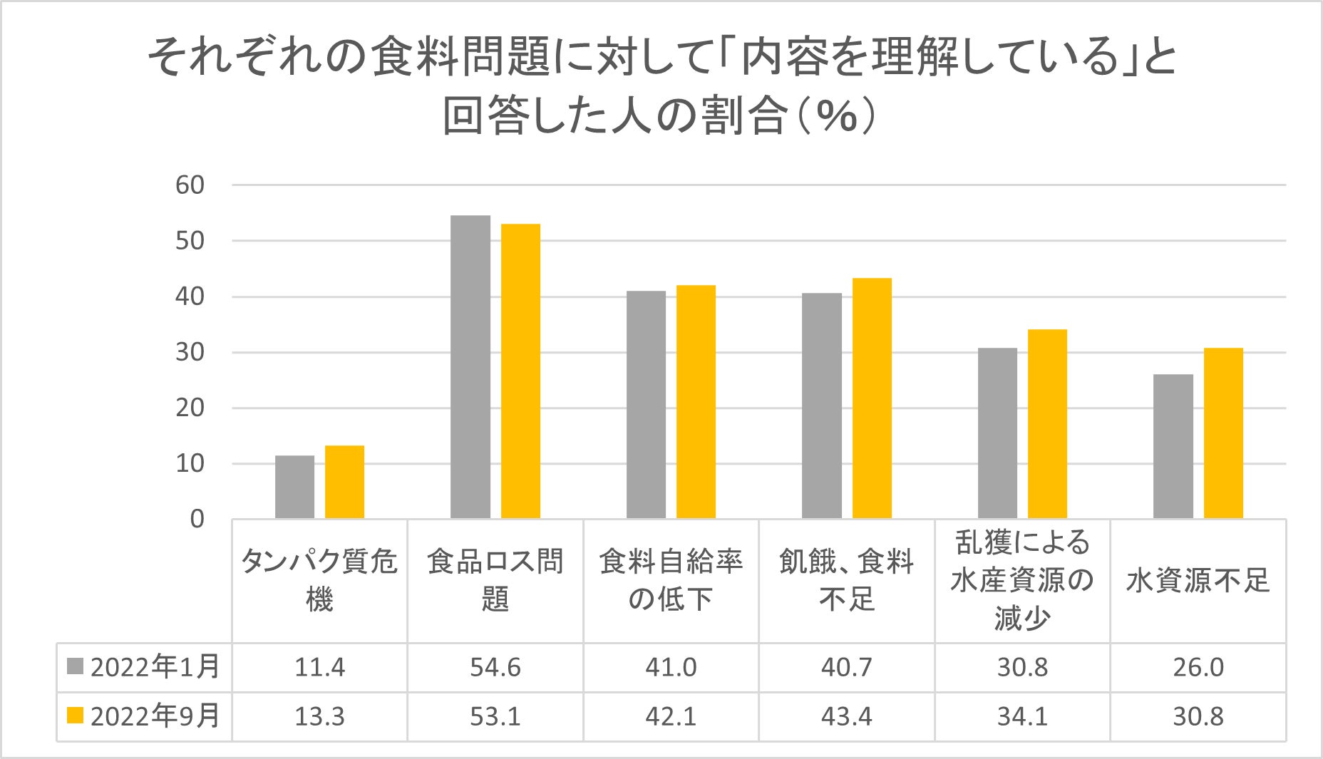 今回実施した「食と環境・昆虫食に関する定点意識調査2022年9月」では、2022年1月に実施※1した際と同様の質問を、改めて15歳~69歳の全国の男女1000名を対象に行いました。その結果、前回実施時と比較して、「タンパク質危機」や「食料自給率の低下」を含む全6項目の食料問題への認知・理解を尋ねる設問の内、5項目にて「内容を理解している」と回答した方が増加しました。