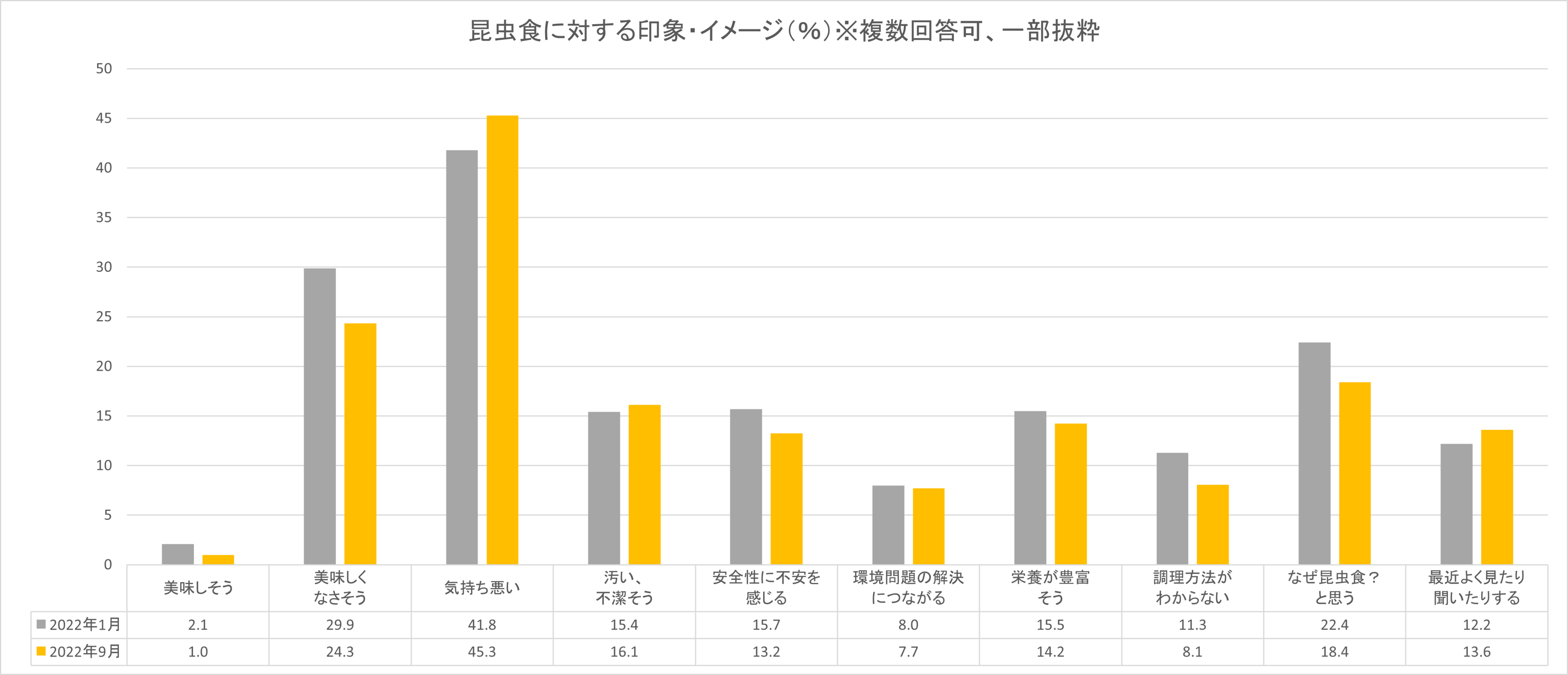 昆虫食に対して抱いている印象やイメージを尋ねる設問では、項目ごとに多少のバラつきはあるものの、前回と比較して大きな傾向の変化は見られませんでした。全体としてネガティブな項目が票を集めただけでなく、「環境問題の解決につながる」に対する回答が7.7%しかなかったように、昆虫食が社会課題の解決策として認知されていないと判明しました。