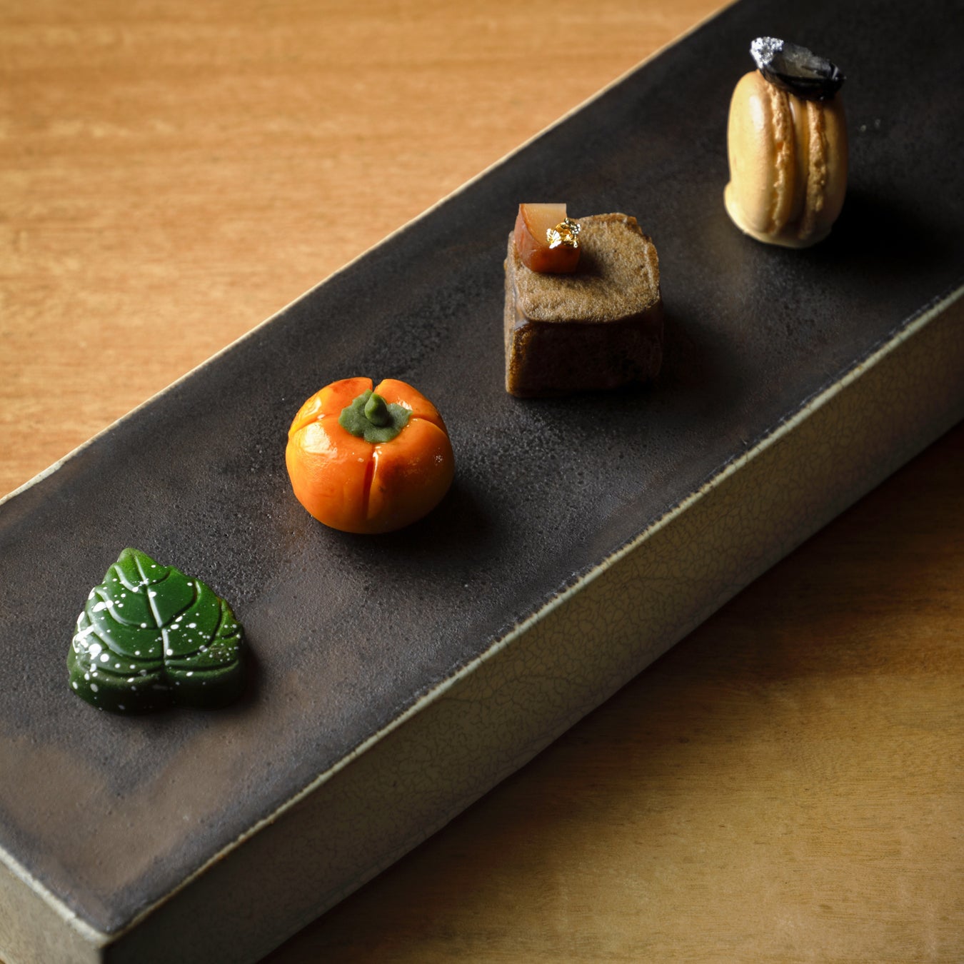 甘味を担当するのは、まるで芸術品のような繊細なスイーツを数々手がけてきたエグゼクティブペストリーシェフ松尾浩幸。アマン京都の森の庭で採れた北山杉の新芽や山椒を忍ばせたスイーツから、京都産大枝柿や丹波栗など、秋の京都の味わいでつくる和菓子のように愛らしい甘味をお楽しみください。