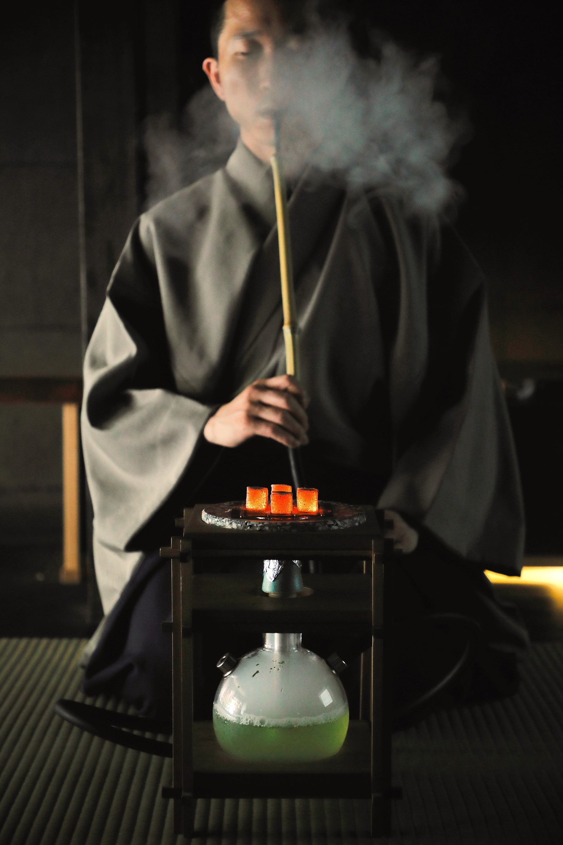お食事の後は、京都を拠点とするアートコレクティブOchill(オチル)による、新感覚のエクスペリエンス「茶香」へご案内いたします。炭をおこして茶葉を熱し、水たばこの原理を応用した特別にあつらえた竹製の水パイプで、気化され和らいだ茶の香りそのものを鼻腔で芳います。飲むお茶とはまた違う新たな茶味をご堪能いただけることでしょう。このたびは、松尾特製の和三盆と丹波黒豆のマカロンも特別にお土産にご用意しております。