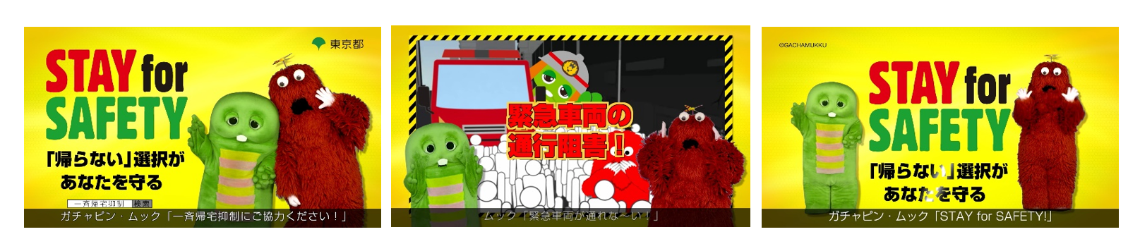 放映する動画は、東京都総務局総合防災部が作成した「一斉帰宅の抑制」や「群衆なだれの危険性」についてガチャピン・ムックが簡潔に解説する内容となっています。日本語版と英語版の2種類を放映し、外国人の観光客等に向けての啓発も行います。