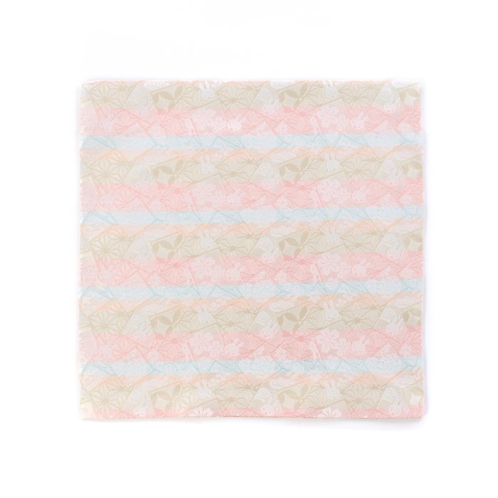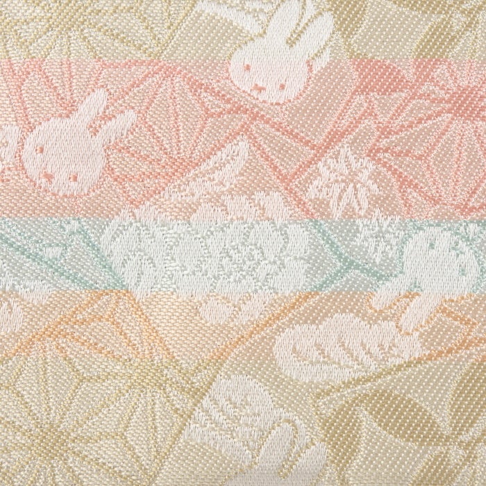 その中から円満の意味を持つ七宝と、健やかな成長を願う麻の葉の絵札を中心に散りばめられた中、ミッフィーはまるでその合間を愉快にお散歩をしているかのようです。