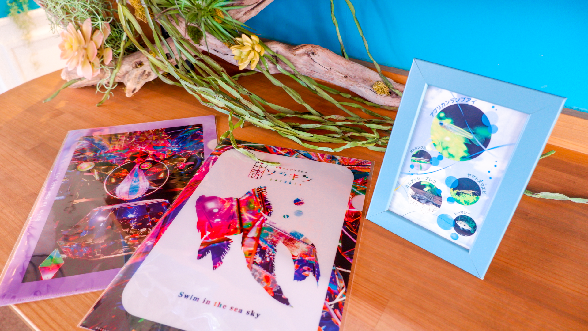 幻想的な光のオブジェプリント柄、大地の癒しをイメージした圧巻のアート『アース』プリント柄、施設看板にもなっている空中飛翔金魚『ソラキン』プリント柄、ペアで購入しても素敵な赤金魚柄と黒金魚柄の5種類となっており、値段は一律550円です。