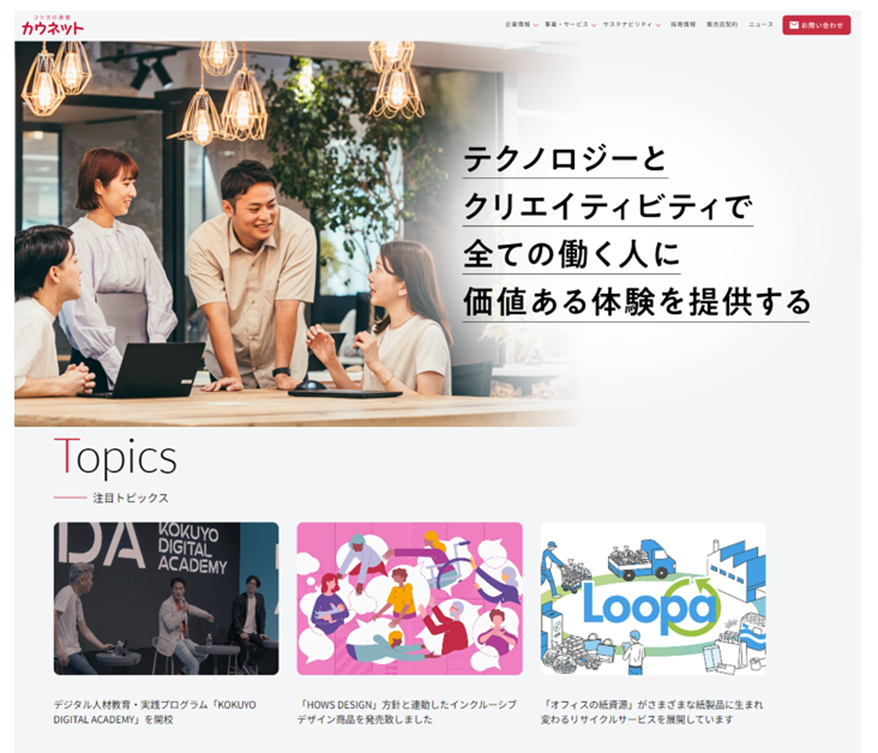 今回のリニューアルでは、カウネットの経営方針、事業内容、挑戦し続ける姿勢をより分かりやすく構成しデザイン変更しただけでなく、サステナビリティに関する取り組み全般についてご理解いただけるよう、新たにコンテンツを追加しました。特に強化している環境への取り組みについては内容を拡充しています。