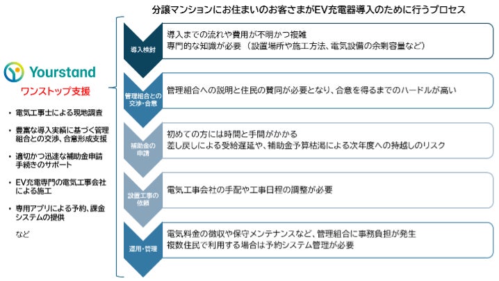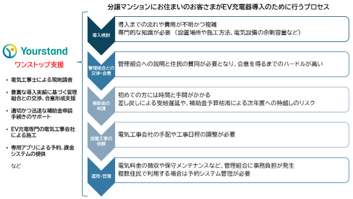ユアスタンドは、集合住宅の管理組合と充電器設置に係る合意を形成する支援、補助金申請、現地調査、設置工事、運用アプリ提供までを一気通貫でサポートし、充電器設置に関するお客さまの負担を大幅に軽減します。