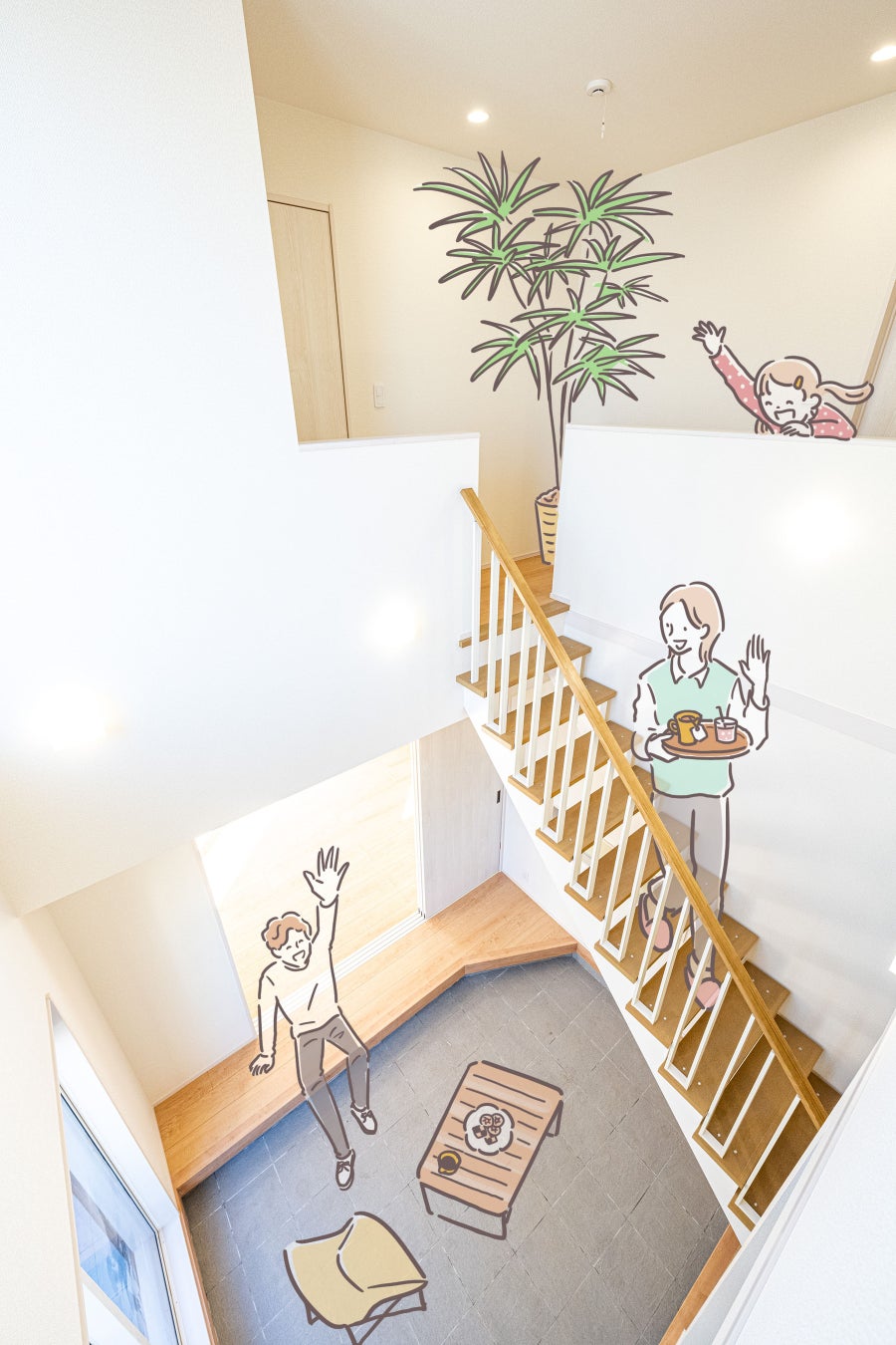 玄関と居間の間、家の中心に広い土間を造り、吹き抜け空間としたことで、家中が繋がり家族の気配がどこにいても感じられます。