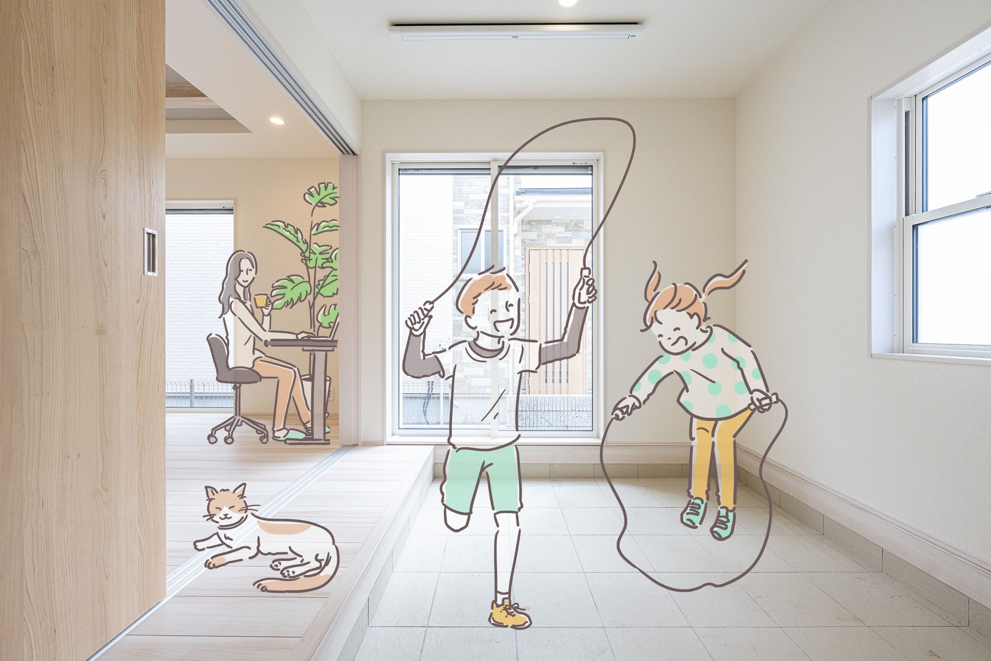 タイル床により夏は冷気、冬は大きな掃出し窓による陽だまりゾーンもある、家族みんなが寒暖や昼夜を気にせず楽しめる場所。