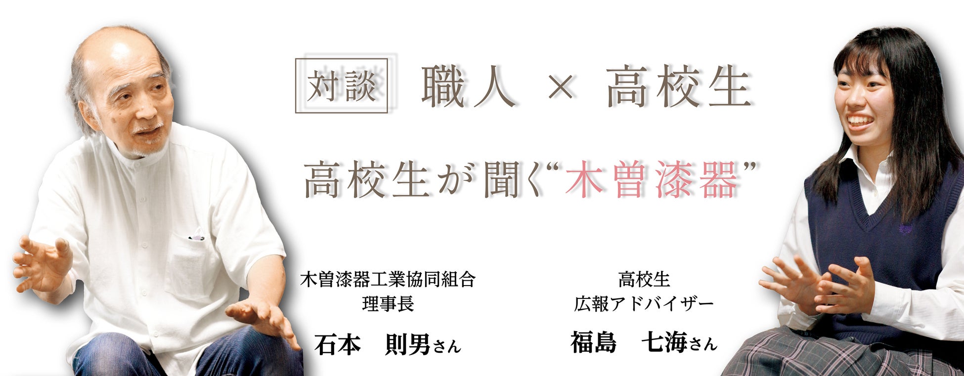 職人でもあり木曽漆器工業協同組合理事長を務める石本則男さんと高校生広報アドバイザーの福島七海さんとの対談を掲載。福島さんが木曽漆器に触れて実際に感じたことを伝えたり、扱い方など疑問に思ったことを質問したりして、対談形式で木曽漆器の置かれている状況や性質などを分かりやすくお伝えしています。
