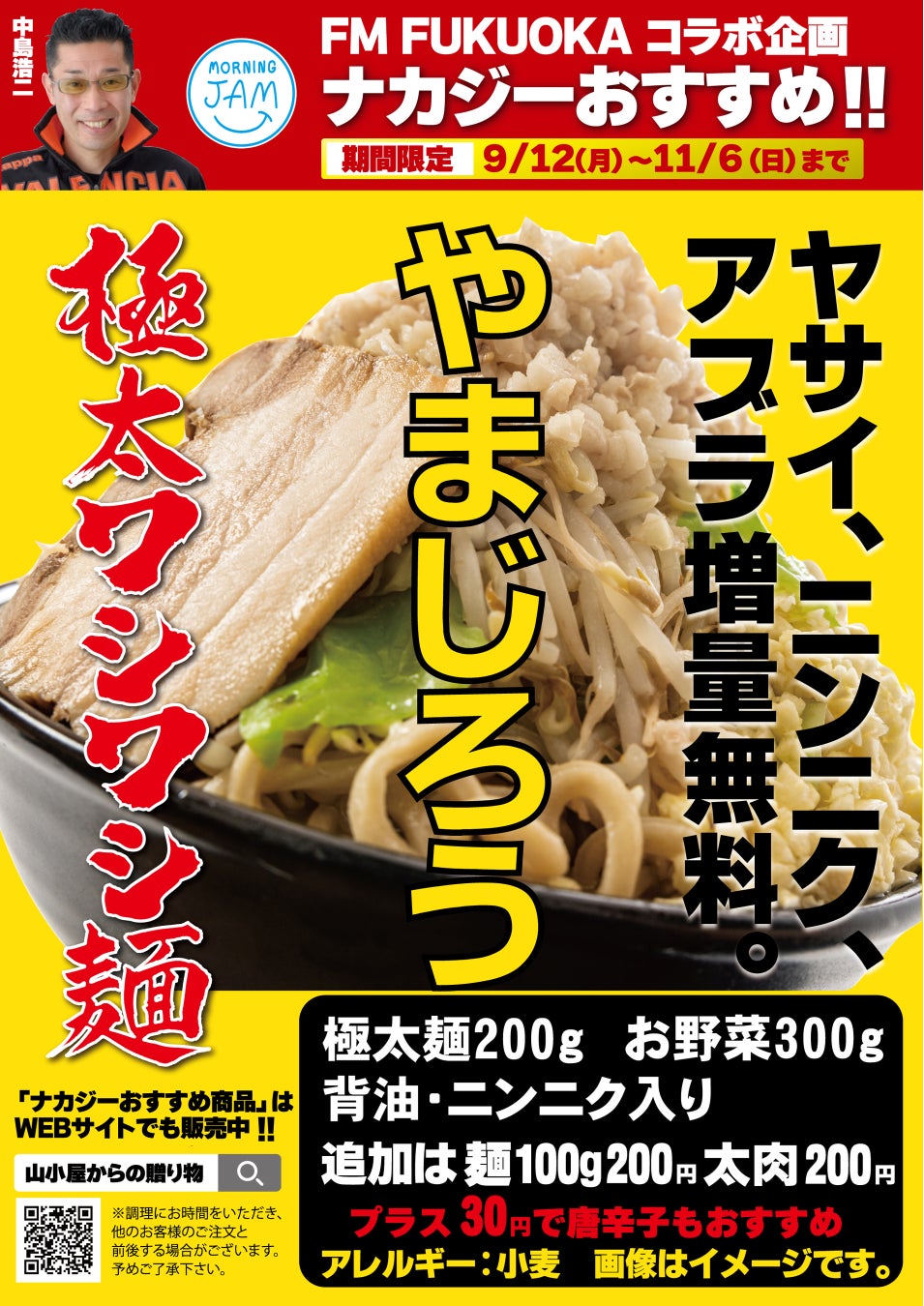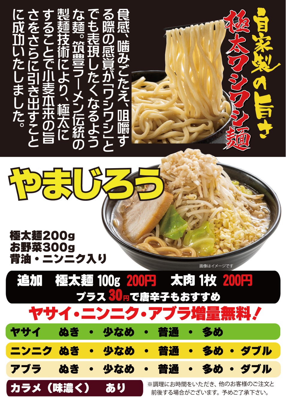九州筑豊ラーメン史上初の極太ワシワシ麺「やまじろう」を是非ご堪能ください。