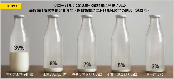 年間出生数が最も多い地域であるアジアでは、妊産婦向け乳製品の新製品開発において世界的にリードしています。ミンテル世界新商品データベース(Mintel GNPD)によると、2018年~2022年に発売された世界の新商品の中で、母親向け訴求が含まれる食品・飲料(乳製品)は、アジア太平洋地域が39%と他地域よりも非常に多くなっています。