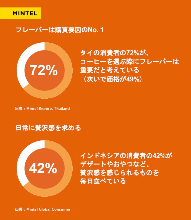 タイの消費者の72%が、コーヒーを選ぶ際にフレーバーは重要と考えていることからも、東南アジアの消費者にとって、フレーバーは非常に重要であると言えます。また、インフレの圧力があるにもかかわらず、東南アジアの消費者が家計の一部を新たなフレーバーの探求に費やしていることも分かっています。家計のやりくりが厳しい時代に、新たなフレーバーを試したいという意欲があるということは、彼らの間で広がる「贅沢感」への逃避を表しています。