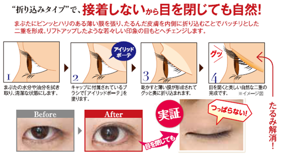 アイリッドボーテEXは目元の悩みを解決するために生まれた、まぶた形成アイテムです。物理的にたるみを引き上げる、一重まぶたに折り込みを作る、などの形状の変化をもたらし、自由自在に憧れていた自分のなりたい目の形に変えることができます。