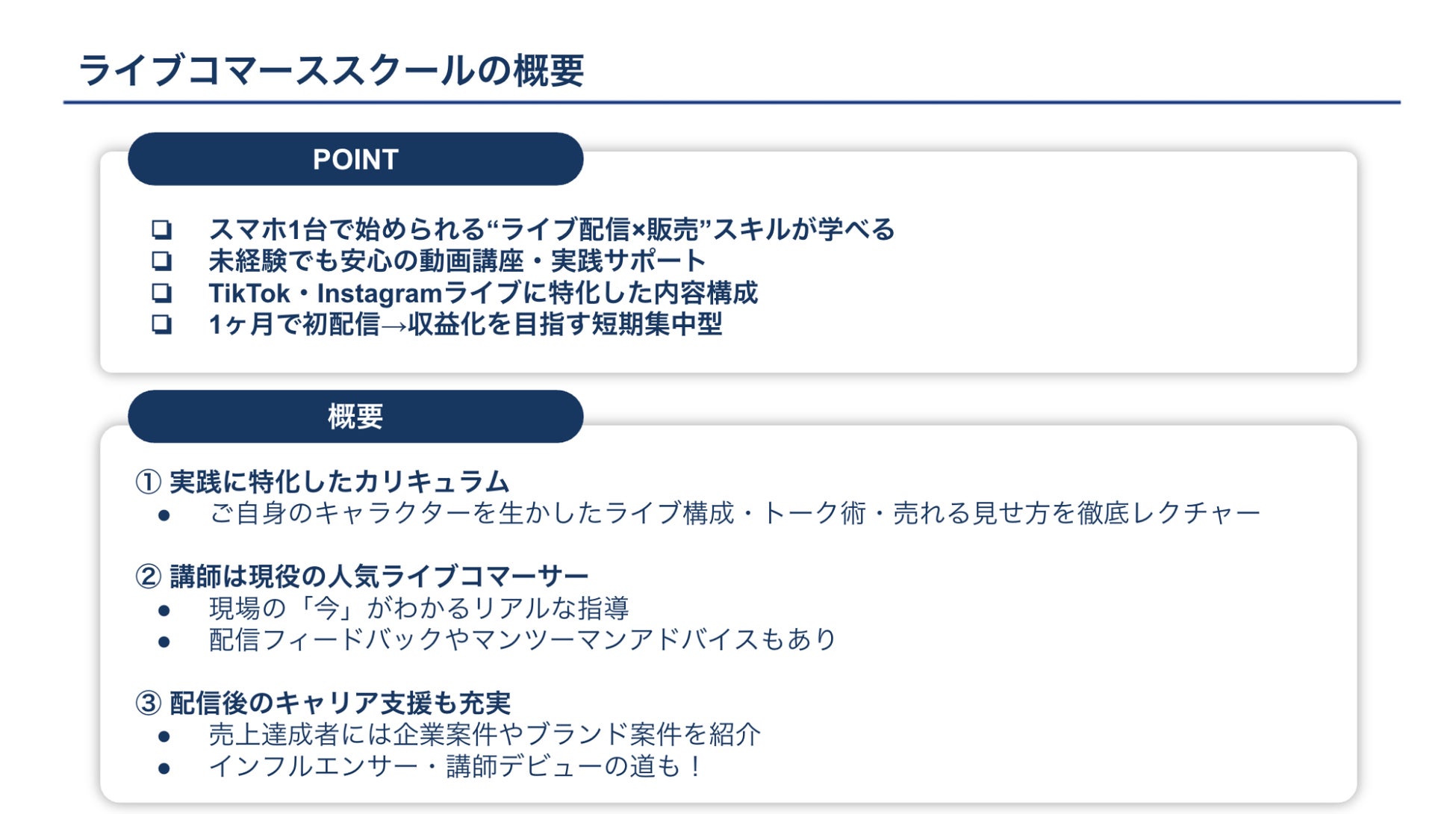 さらに、両社は個人向けにライブコマーススクールも展開予定です。これは、一般の方がTikTokライブを活用して収益を得る「ライバー」として活躍できるよう、基礎から実践までを学べる育成プログラムです。