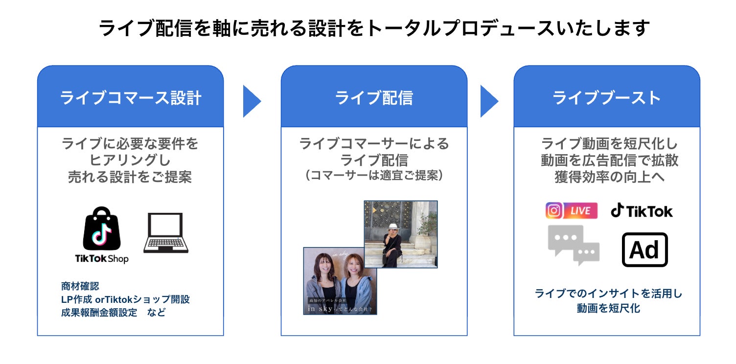 こうした市場環境を背景に両社は共同で、企業がより手軽かつ低リスクでライブコマースに参入できる仕組みとして、企業の商品やサービスをTikTokライブを活用して販売する成果報酬型のライブコマース運用支援サービスを開始いたします。本サービスでは、商材に適したライバーを起用し、企画・運用・分析までをワンストップで支援します。成果が出た分だけ報酬が発生するモデルのため、企業側は初期費用を抑えながら、新たな販売チャネルを構築することが可能です。今後は、ライブ配信を軸としたEC戦略の構築支援から、ライバー育成、販売データの可視化までをワンストップで提供し、より多くの企業の課題解決と売上拡大に貢献してまいります。