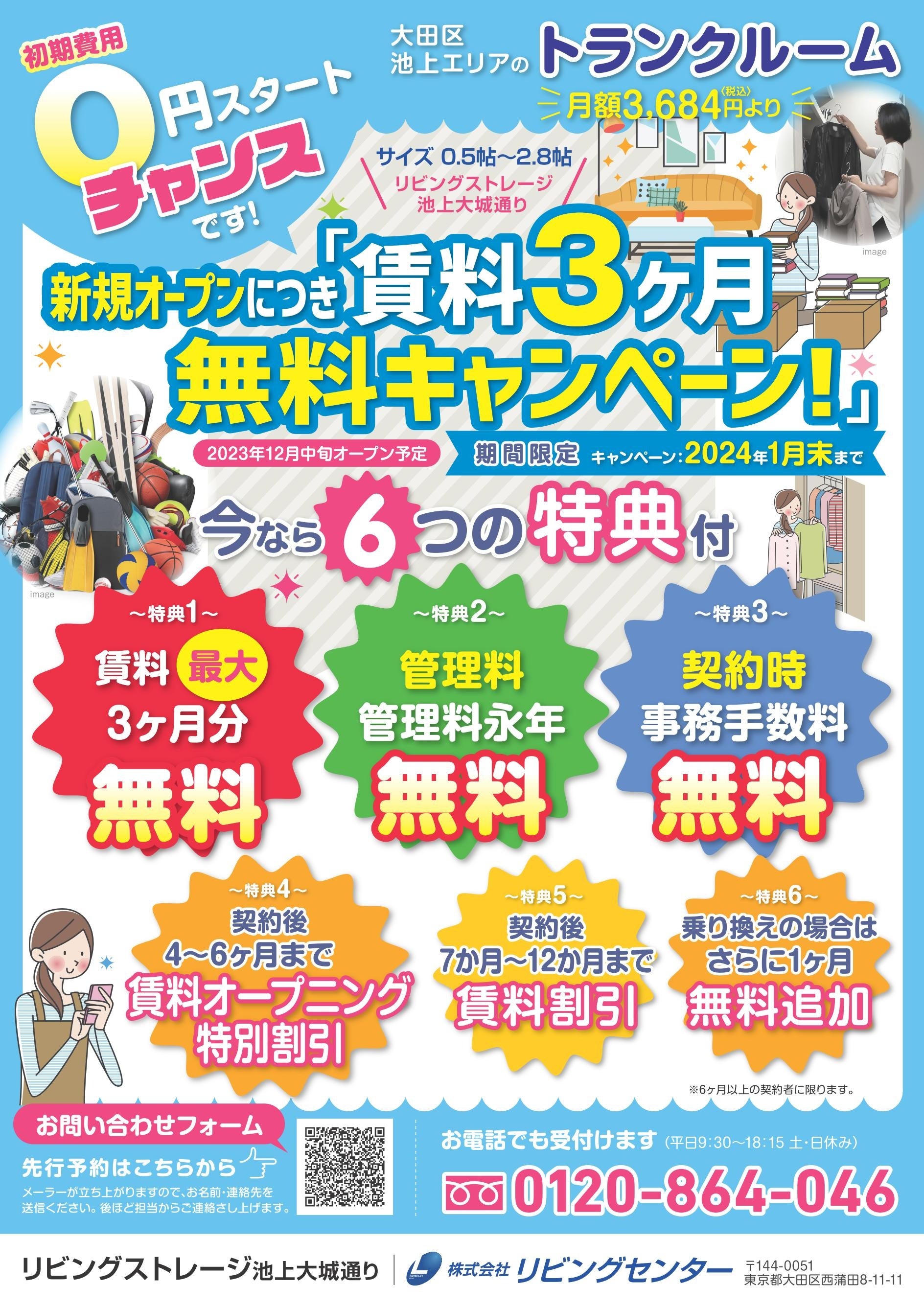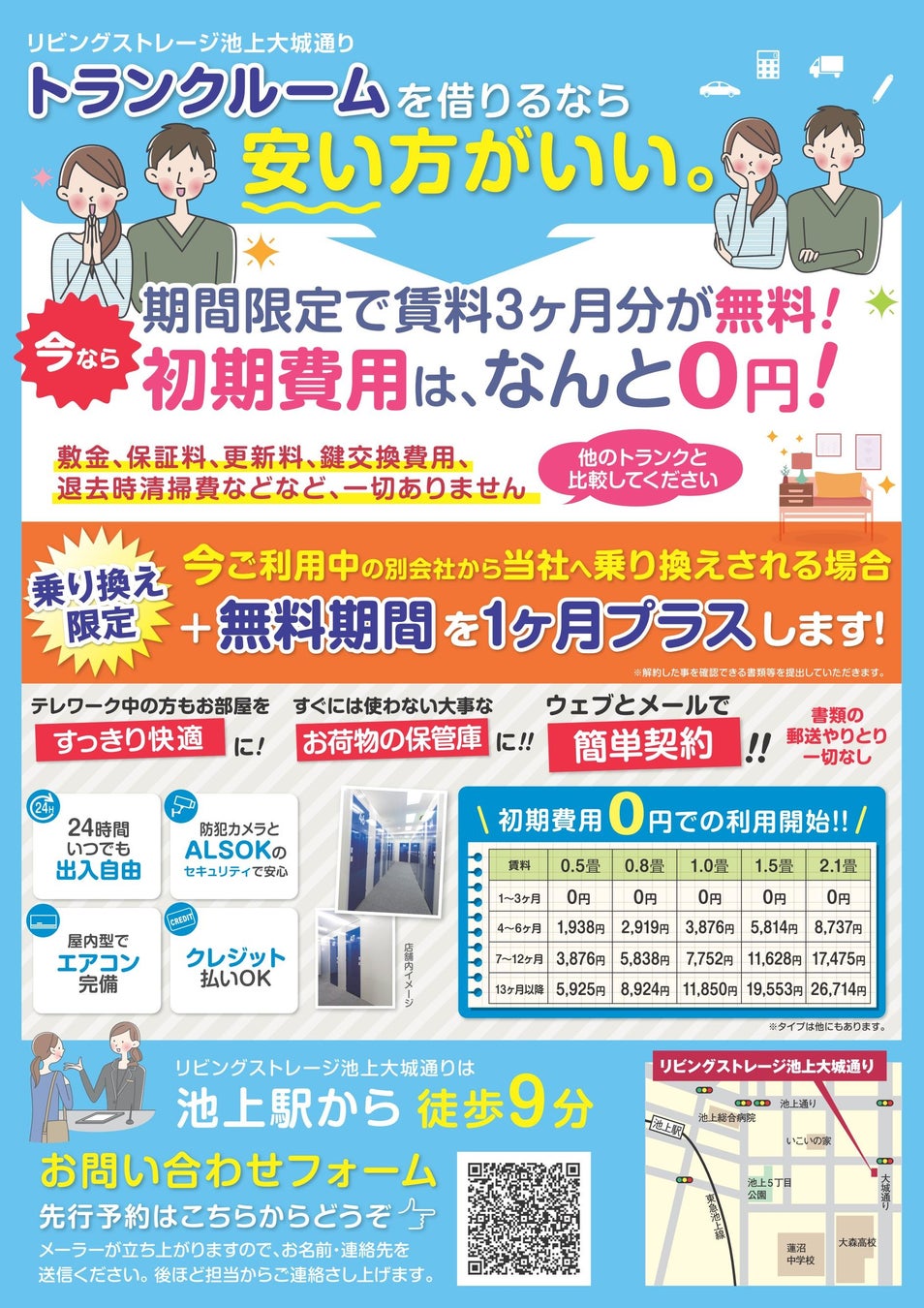 初めてトランクルームを利用される方だけでなく、借り換えを検討されている方にもお得なキャンペーンとなっていますので、ぜひこの機会に「リビングストレージ池上大城通り」をご利用ください。