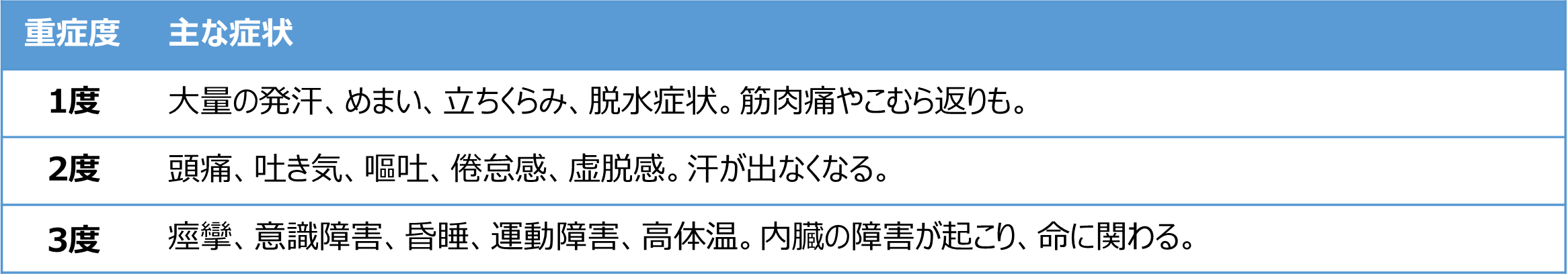 建設業や運送業、警備業、農業など、通気性の悪い衣服を着用する場合や、長時間炎天下で作業が必要な場合は、熱中症リスクが高くなります。大量に発汗するため、水分と塩分が不足し、循環血液量が減少します。