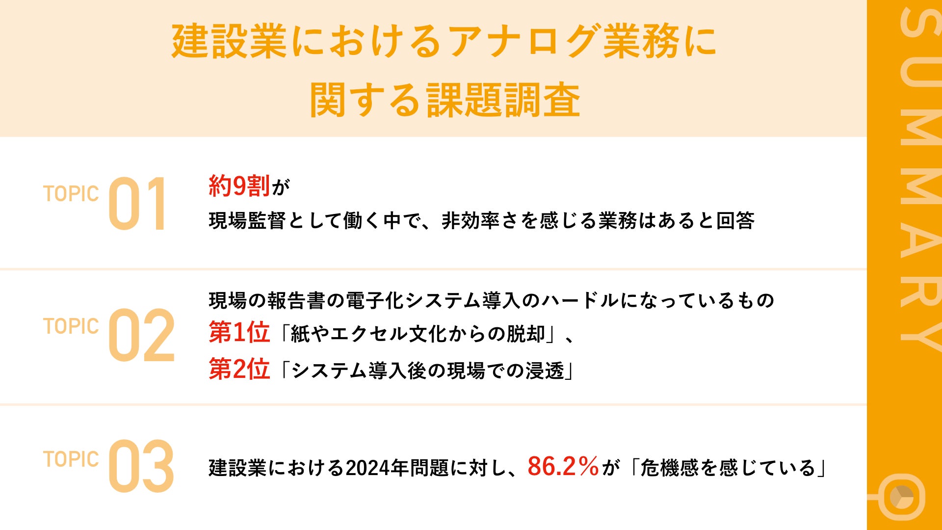 【建設業で叫ばれる「2024年問題」】建設業の現場監督、約9割が業務の「非効率さ」に悩み 一方で約半数が「現場の報告書」電子化システムが未導入に