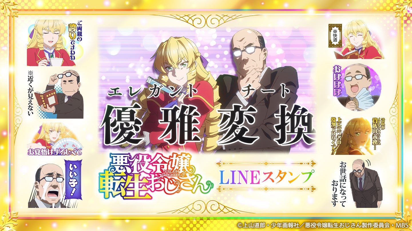 LINEスタンプ TVアニメ「悪役令嬢転生おじさん」第一弾のスタンプとLINE着せかえも、好評販売中です。