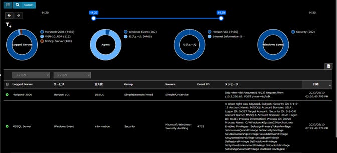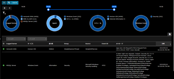 (タイムスライダを使用したログの絞り込みとドーナツチャートによるログ数の可視化)